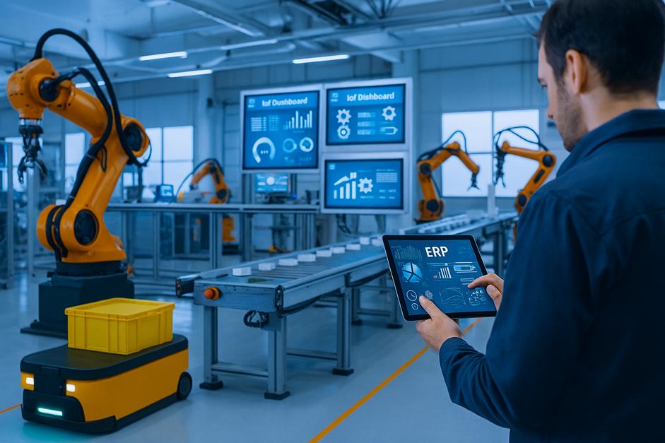 Điểm vượt trội nhất của ERP trong thời đại 4.0 chính là khả năng kết nối và tự động hóa toàn bộ chuỗi hoạt động. Hệ thống này có thể liên kết trực tiếp với các thiết bị IoT, phần mềm quản lý sản xuất (MES), và cảm biến thông minh trong dây chuyền. Nhờ đó, mọi thay đổi nhỏ nhất trong sản xuất – từ việc máy móc ngừng hoạt động, nguyên vật liệu sắp hết, đến tiến độ giao hàng – đều được ghi nhận tức thì và phản ánh lên toàn hệ thống.