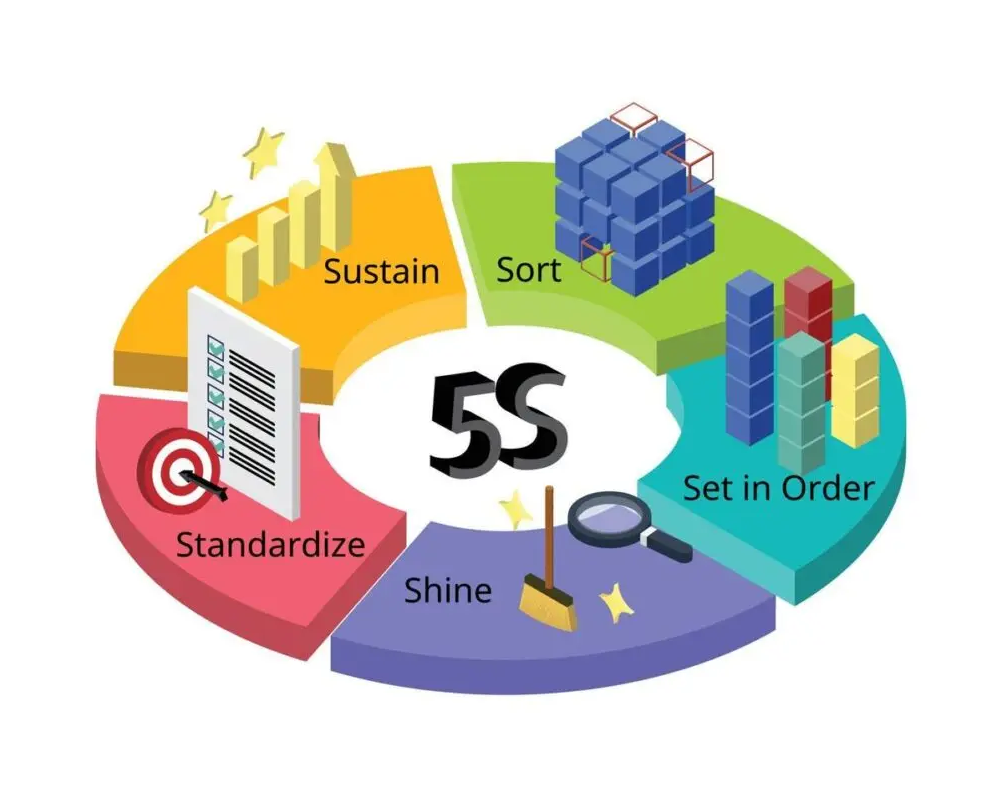 - 5S (Nền tảng của sự ổn định): Là phương pháp quản lý, tổ chức nơi làm việc nhằm tạo ra môi trường sạch sẽ, ngăn nắp và khoa học. Mục tiêu của 5S là hiển thị hóa các vấn đề bất thường và xây dựng tính kỷ luật.