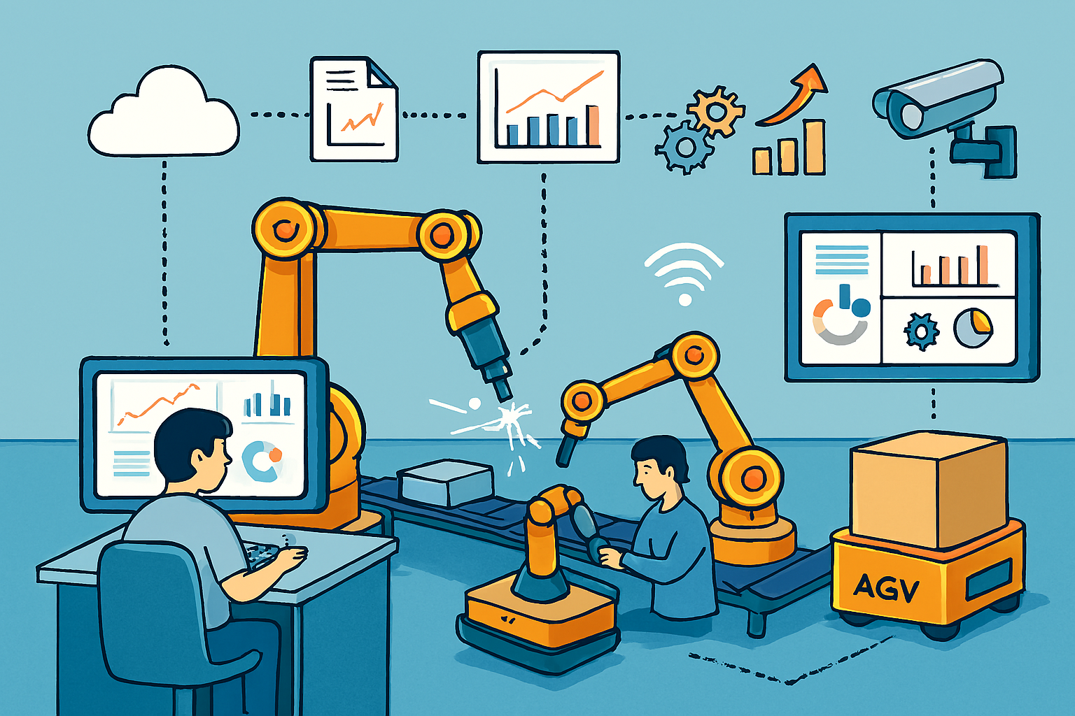 Đây là phần “trái tim” của nhà máy 4.0. Trên dây chuyền, những cánh tay robot và robot cộng tác (cobots) đang làm việc song song với kỹ sư. Robot hàn, siết ốc, lắp ráp, đóng gói với độ chính xác tuyệt đối; con người giám sát, tinh chỉnh, và đảm bảo chất lượng. Mỗi thiết bị, mỗi động cơ đều được gắn cảm biến IIoT, đo rung, nhiệt, tốc độ, điện năng tiêu thụ…